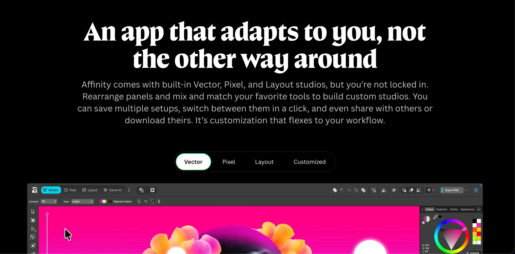 Affinity was built from the ground up for modern hardware. Whether you’re on a Mac with M3/M4 silicon or a mid-range Windows laptop, the performance is buttery smooth. You can switch between Vector, Pixel, and Layout studios in a single click without ever closing your document.
