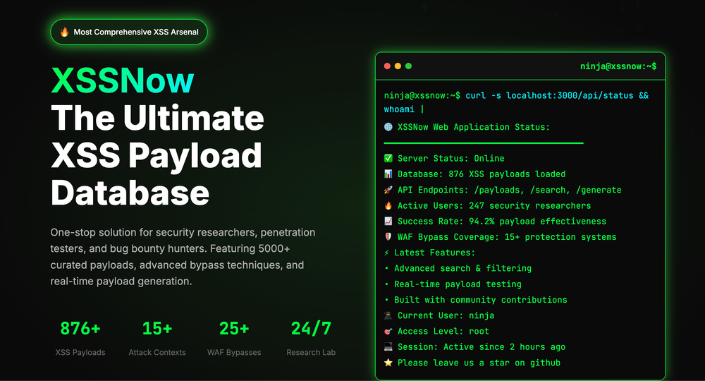XSSNow positions itself as the ultimate XSS payload database for ethical researchers and security testers. It features: